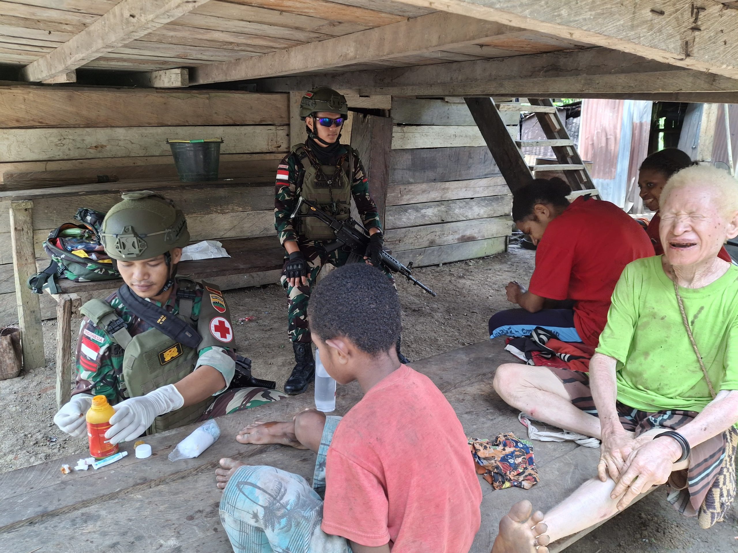 Dalam upaya meningkatkan kesehatan masyarakat, Personil Satgas Pamtas Statis RI-PNG Yonif 131/BRS berikan pelayanan kesehatan gratis dan pengecekan kesehatan keliling bagi masyarakat di Kampung Kali Lapar, Kab. Keerom, Papua, *Sabtu (09-11-2024)*.