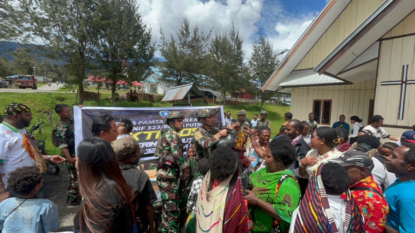 Wujud Kebahagiaan menjelang peringatan HUT Yonif 323/Buaya Putih Kali Ini berbagi kasih kepada Jemaat dan pengurus gereja Katolik St Strphanus, Kampung Kago, Distrik Ilaga, Kab.Puncak. Papua Tengah, Minggu (10/11/24)