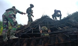 Prajurit Titik Kuat Kosatgas Ilaga Pimpinan Pasiter Satgas Letda Chk Dani memberikan bantuan tali asih berupa Sembako dan Gitar kepada pengurus Gereja dan Jemaat Gereja Katolik St Stephanus Kampung Kago.
