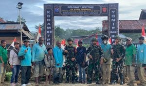 Prajurit Titik Kuat Kosatgas Ilaga Pimpinan Pasiter Satgas Letda Chk Dani memberikan bantuan tali asih berupa Sembako dan Gitar kepada pengurus Gereja dan Jemaat Gereja Katolik St Stephanus Kampung Kago.