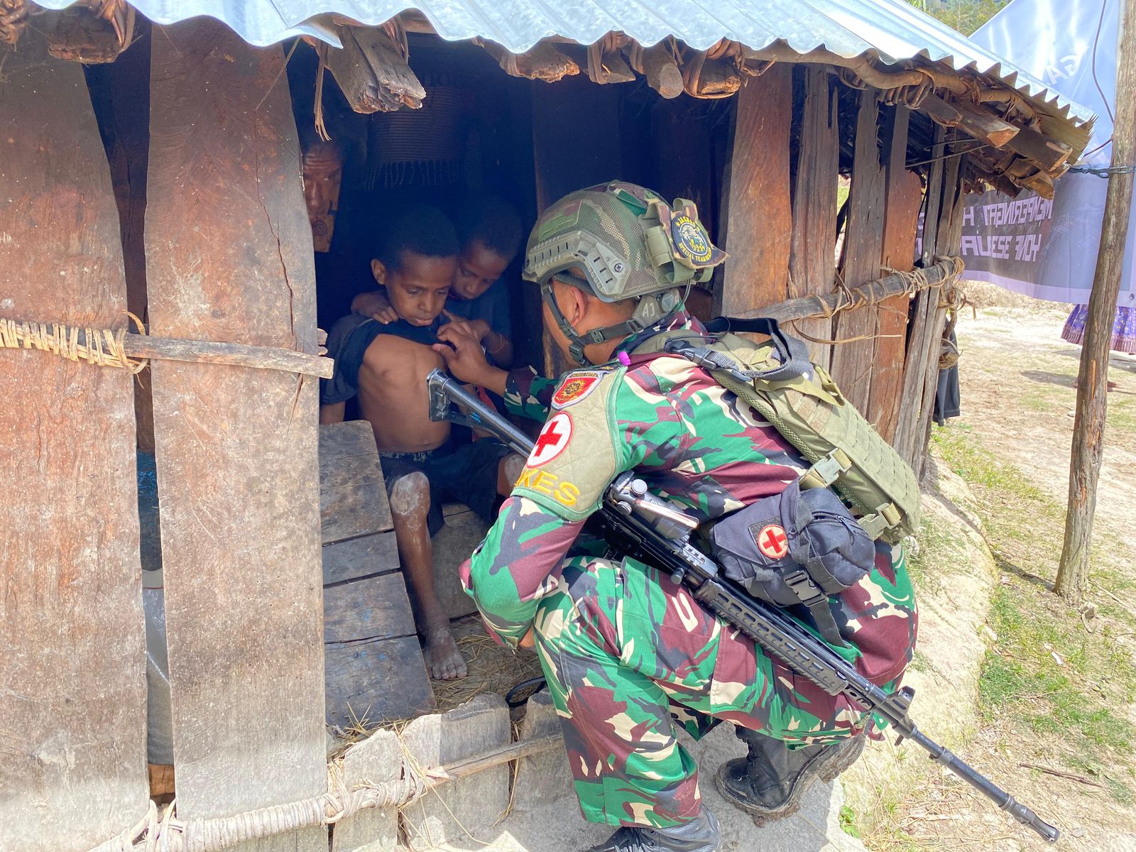 Personel TK Kosatgas Yonif 323 Buaya Putih dipimpin Dokter Satgas Lettu Ckm dr Rifky menggelar acara pengobatan gratis kepada masyarakat Kampung Kimak bertempat di halaman Honai bapak Pilnus