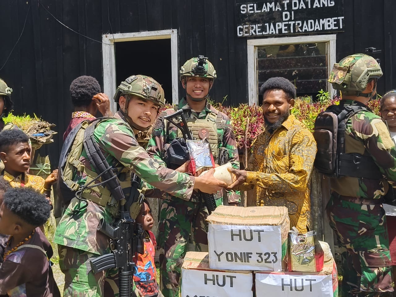 Satgas Yonif 323 Buaya Putih TK Dangbet melalui kegiatan Minggu Kasih terus berbagi kasih dengan masyarakat dengan membagikan 20 Paket Sembako dan Pengecatan Gereja, kegiatan minggu kasih ini bertempat di Gereja Pertra Dambet Klasis Beoga, Kampung Dangbet, Distrik Beoga, Kabupaten Puncak, Papua Tengah, Minggu kemarin (17/11/24).