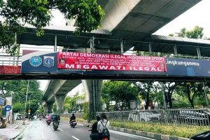 Sebuah spanduk bertuliskan “Partai Demokrasi Ilegal Indonesia (PDIP)” dengan tambahan klaim “Megawati Ilegal” ditemukan terpasang di dekat Gama Tower, Jakarta Selatan, sekitar pukul 03.00 WIB pada Jumat dini hari.