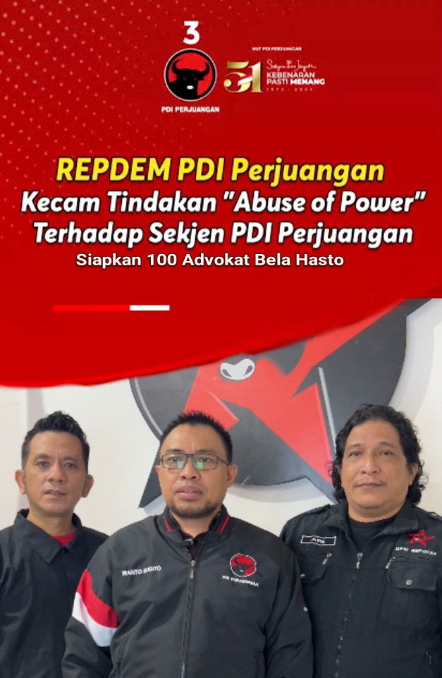 “Ketika marwah partai diserang oleh pihak anti demokrasi, maka Repdem tidak akan tinggal diam. Kami telah menginventarisir anggota kami yang berprofesi sebagai advokat dan kami tugaskan bergabung dengan tim kuasa hukum PDI Perjuangan mendampingi Pak Hasto Kristiyanto, Sekjen PDI Perjuangan,” kata Abe. Sabtu (28/12/2024).