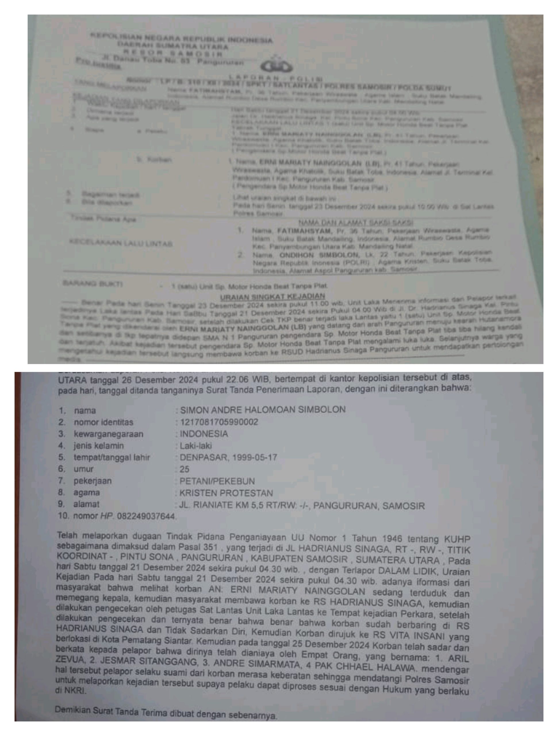 Berdasarkan data, diduga laporan Polisi Polres Samosir ini bernomor : B.310/XII/2024/SPKT/SATLANTAS/POLRES SAMOSIR/POLDA SUMUT, tertanggal 23/12/2024!