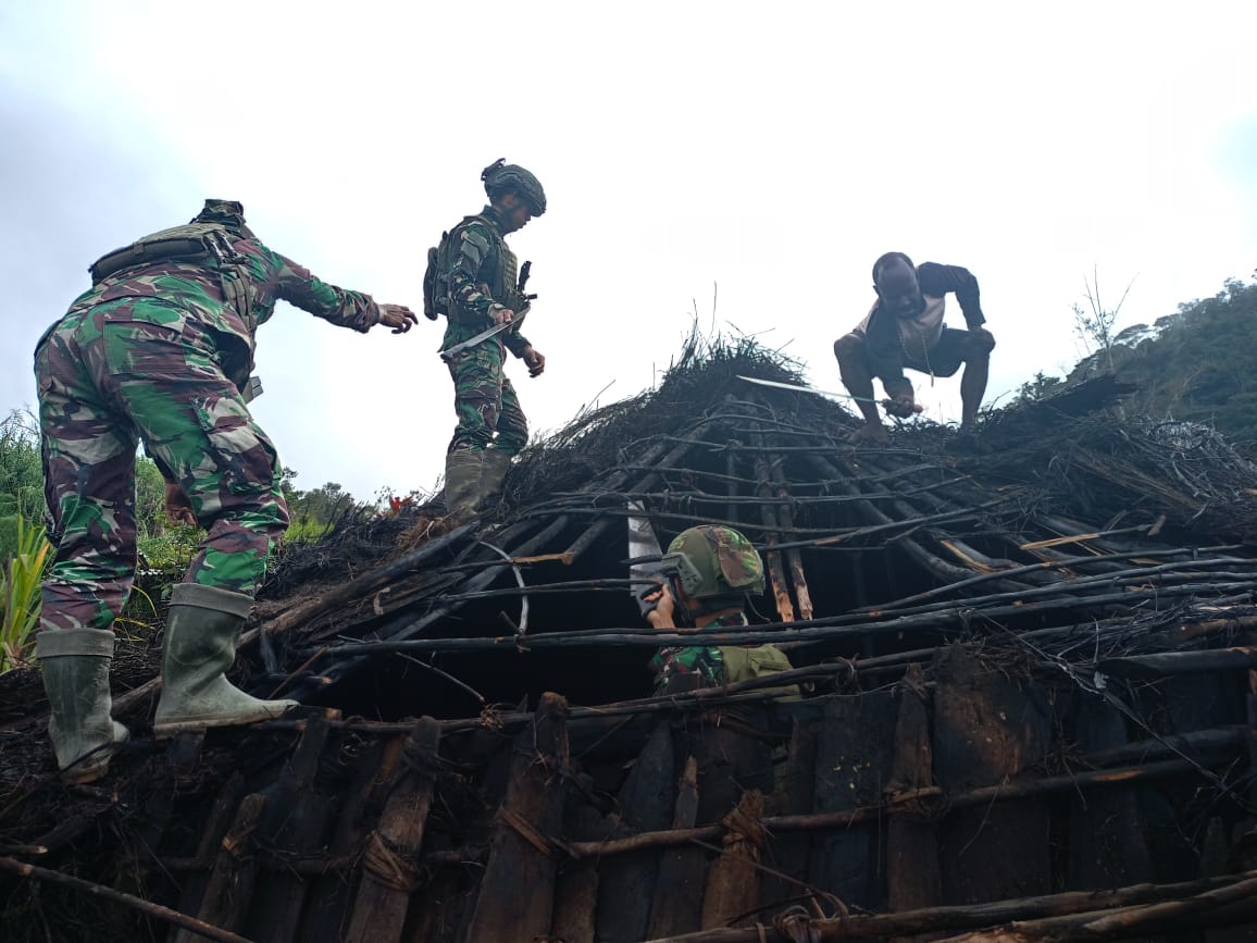 Di awal tahun 2025, Personel Titik Kuat Pintu Jawa Satgas Pamtas Mobile Yonif 323/Buaya Putih Kostrad gotong royong bersama masyarakat memperbaiki honai yang rusak tertimpa pohon, di Kp. Wombru, Distrik Mage’abume, Kab. Puncak, Papua, Sabtu (18/01/2025).