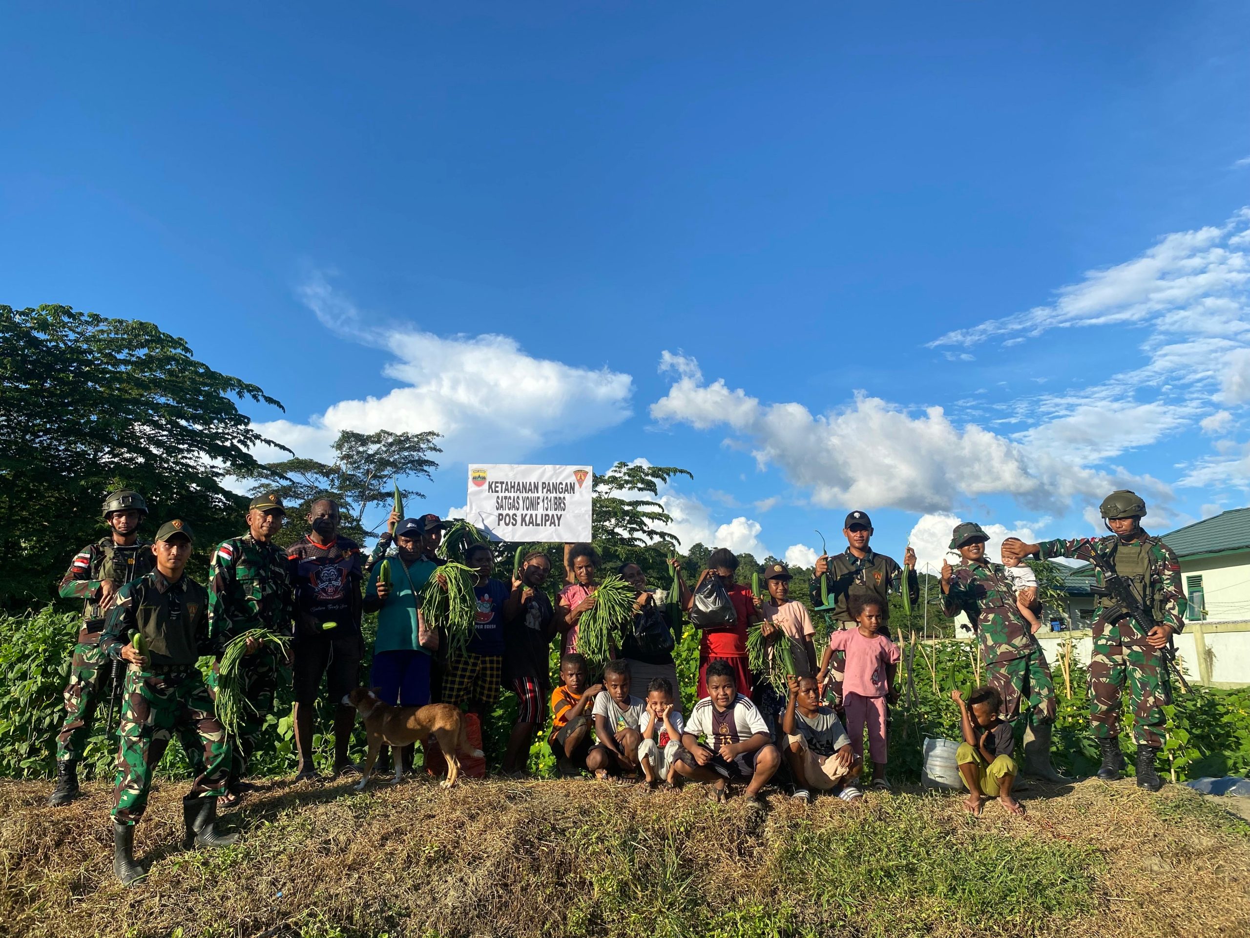 Satgas Pamtas RI-PNG Yonif 131/BRS Pos Kalipay bersama masyarakat Desa binaan langsung terjun ke kebun untuk melakukan panen perdana Sayuran, di Kebun percontohan Pos Kalipay di kampung Pund, Distrik Waris, Provinsi Papua, Rabu (22/01/2025).