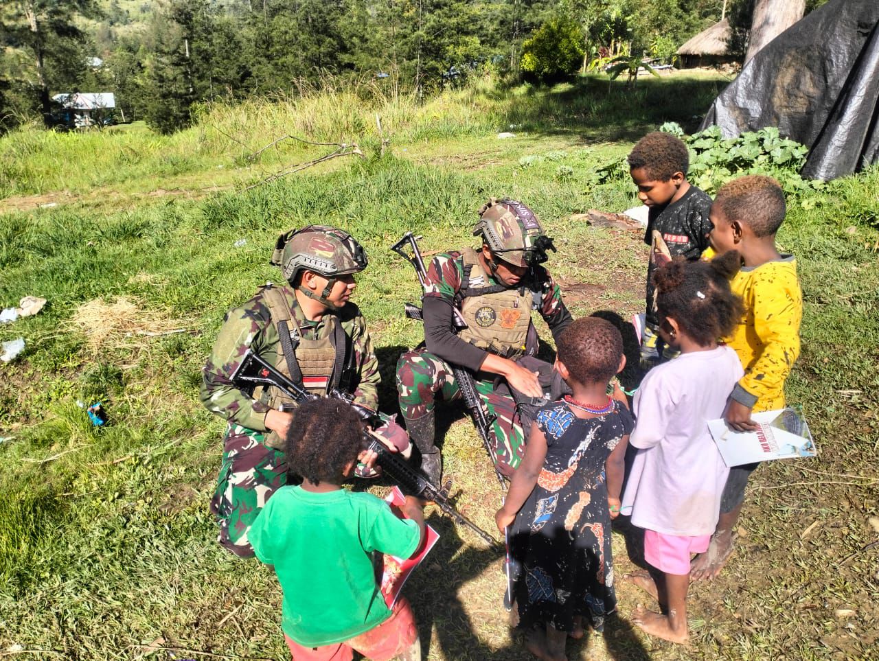 Prajurit Buaya Putih Kostrad Bagi-Bagi Buku Tulis Untuk Anak-Anak Kampung Kago