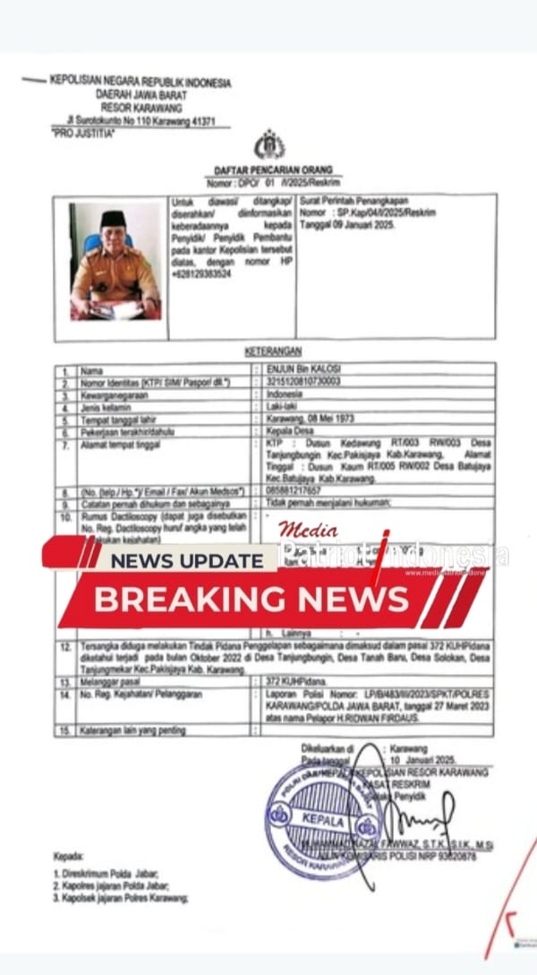 “Kades Enjun yang dikenal dengan sebutan lurah Jago dan Dukun sakti yang menjadi buronan (DPO) setelah kami laporkan ke Polres Karawang dan ditetapkan statusnya dalam daftar pencarian orang dengan nomor DPO/001//IV/2025, cetus Arkan Cikwan kepada awak media, Rabu, 19/02/2025.