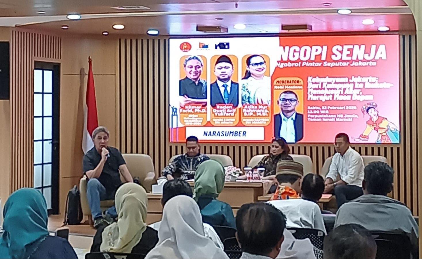 Dhinni Mudiani Ketua Umum Perkumpulan GERAK, kembali menggelar diskusi publik atau “Ngopi Senja” (Ngobrol Pintar Seputar Jakarta) dengan mengangkat tema “Kebudayaan Jakarta: Dari Kampung ke Ibukota – Menelusuri Akar, Merajut Masa Depan” Sabtu (22/2/25).