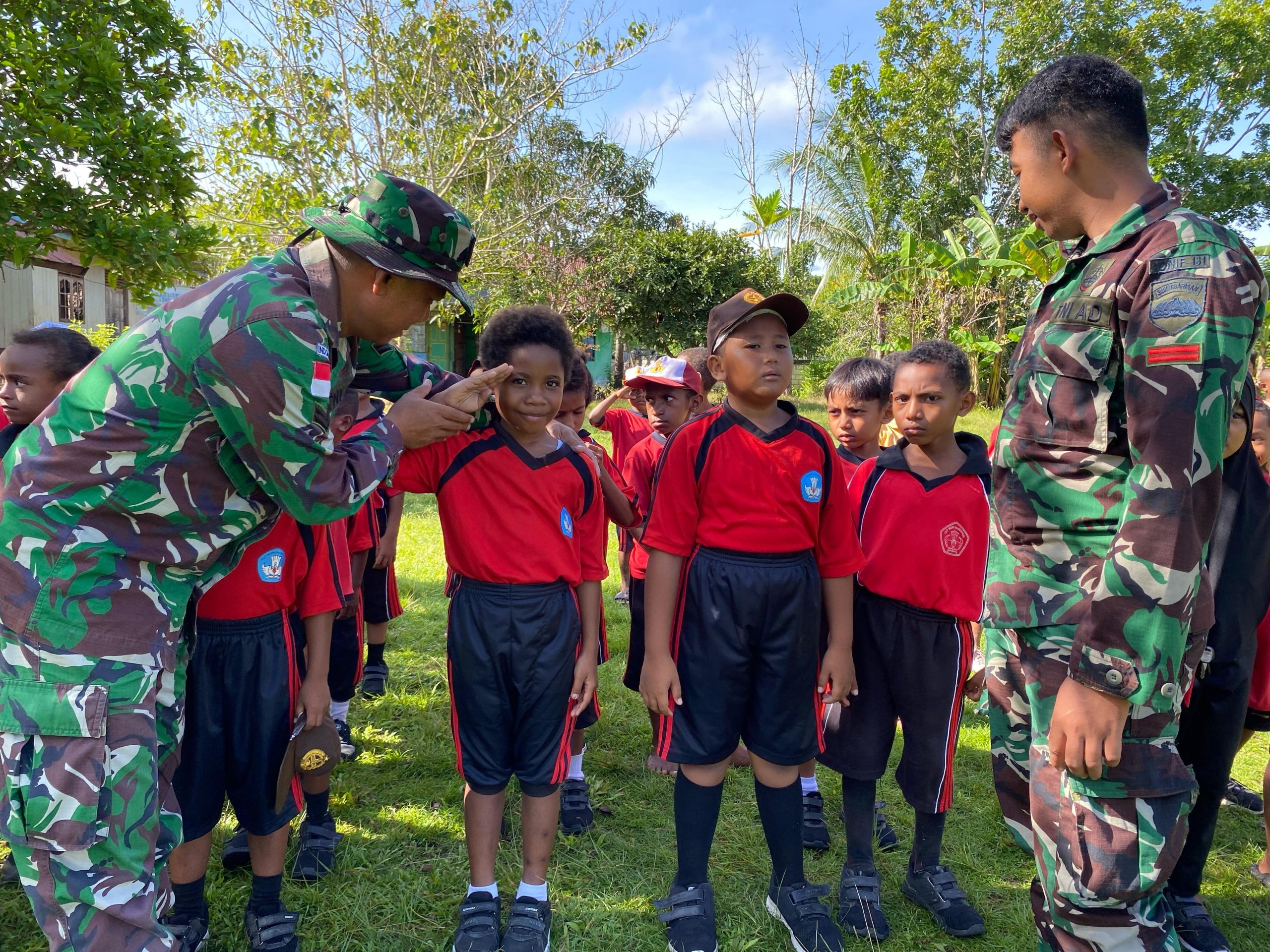Dalam rangka melatih kedisiplinan sejak dini, Satgas Yonif 131/BRS melalui Pos Yamara mengajarkan materi dasar Peraturan Baris-Berbaris (PBB) kepada siswa siswi SD Inpres Pir V, di Kampung Yamara, Distrik Waris, Papua, Selasa (25/02/2025).