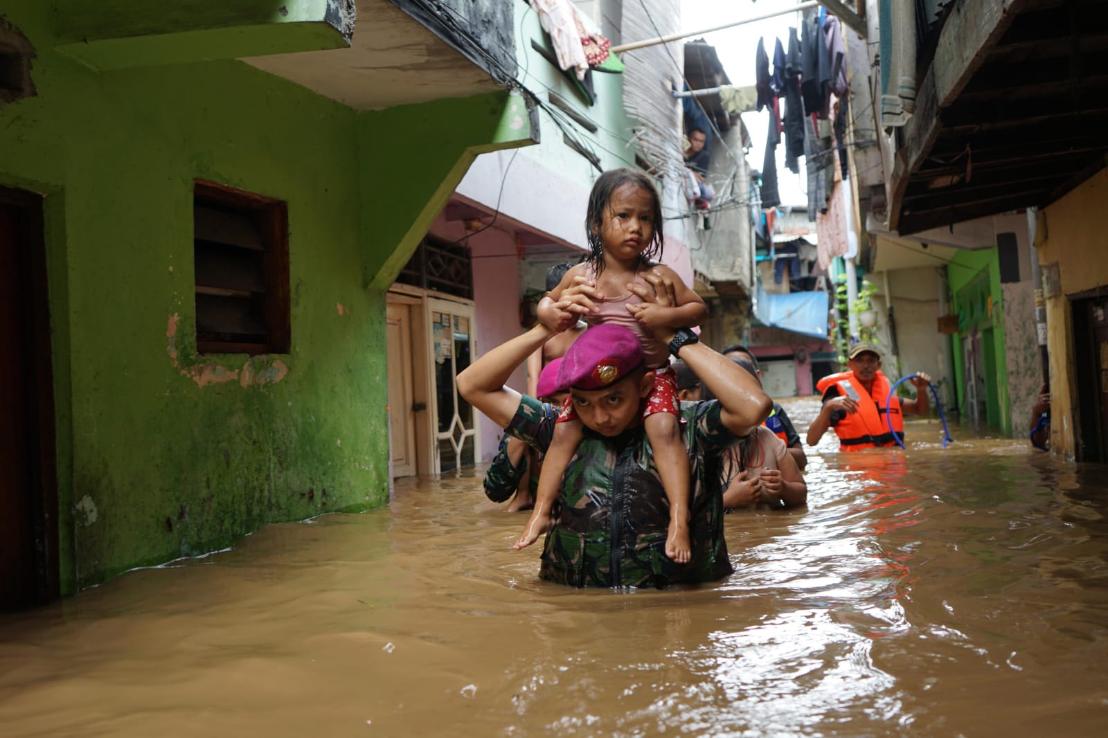 Prajurit Pasmar 1 Korps Marinir kembali menunjukkan aksi tanggapnya yang dengan cepat melaksanakan evakuasi terhadap korban banjir yang berada di wilayah Kebon Pala, Jakarta Timur, Selasa (04/03/2025).