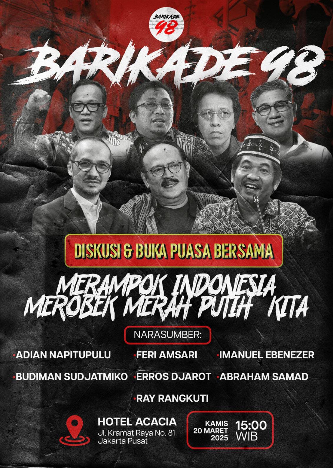 Isu pemberantasan korupsi mencuat dalam diskusi bertajuk Merampok Indonesia, Merobek Merah Putih Kita yang digelar Barikade 98 di Hotel Acacia, Jakarta, Kamis (20/3/2025).
