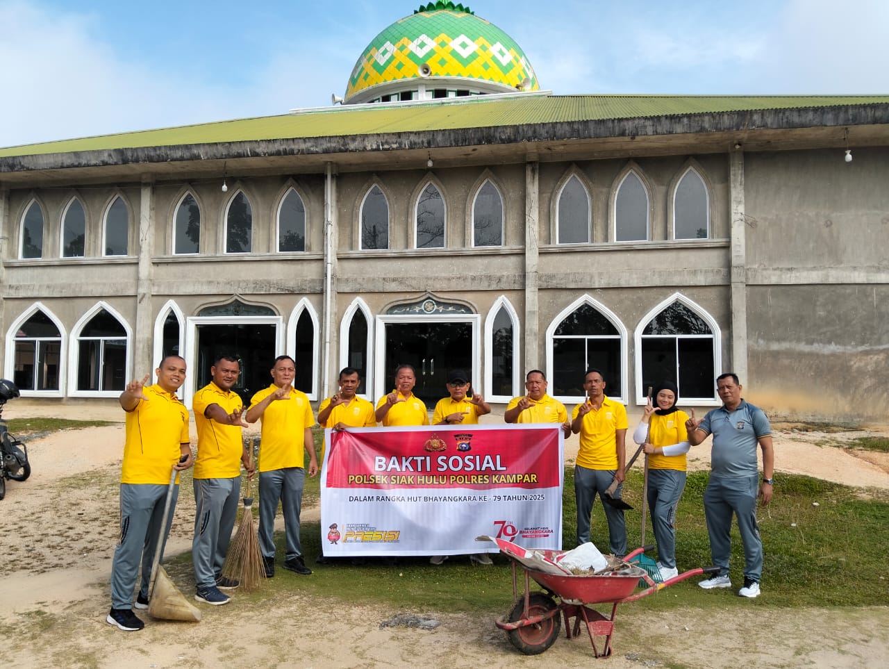 Dalam menjelang memperingati Hari Bhayangkara ke-79, Polsek Siak Hulu menggelar kegiatan Bhakti Religi dan Bhakti Sosial dengan melakukan gotong royong membersihkan areal Masjid Syuhada di Desa Pangkalan Baru, Kecamatan Siak Hulu, Kabupaten Kampar, Sabtu (21/6/2025). Kegiatan yang dimulai pukul 09.00 WIB ini dipimpin langsung oleh Wakapolsek Siak Hulu, AKP Yulius, S.Psi, dan diikuti oleh para Kanit dan personel Polsek Siak Hulu.