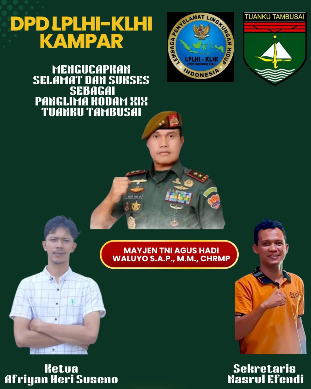 “Atas nama seluruh jajaran pengurus DPD LPLHI KLHI Kabupaten Kampar, kami mengucapkan selamat kepada Mayjen TNI Agus Hadi Waluyo, yang diangkat sebagai Pangdam XIX/Tuanku Tambusai. Semoga amanah ini membawa keberkahan dan kemajuan bagi wilayah Riau,” demikian disampaikan Afriyan Heri Suseno, Ketua DPD LPLHI KLHI Kampar.