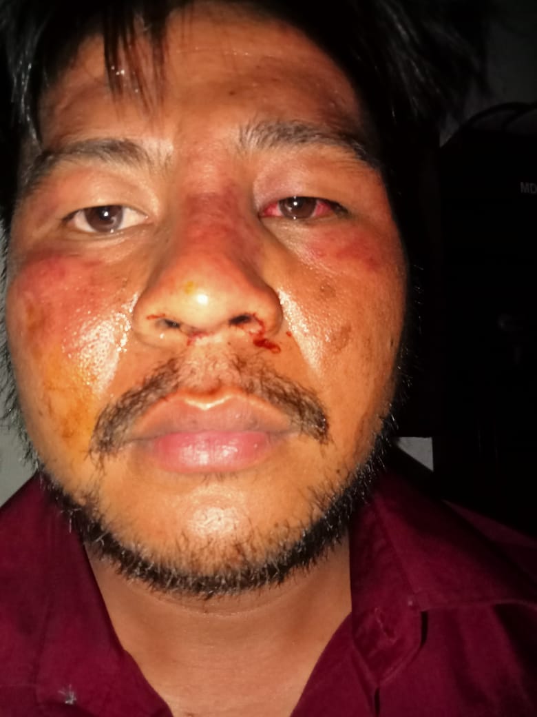 Wajahnya terluka parah, tertoreh bekas sepatu, sementara hidungnya memar akibat tendangan saat ia terkapar.