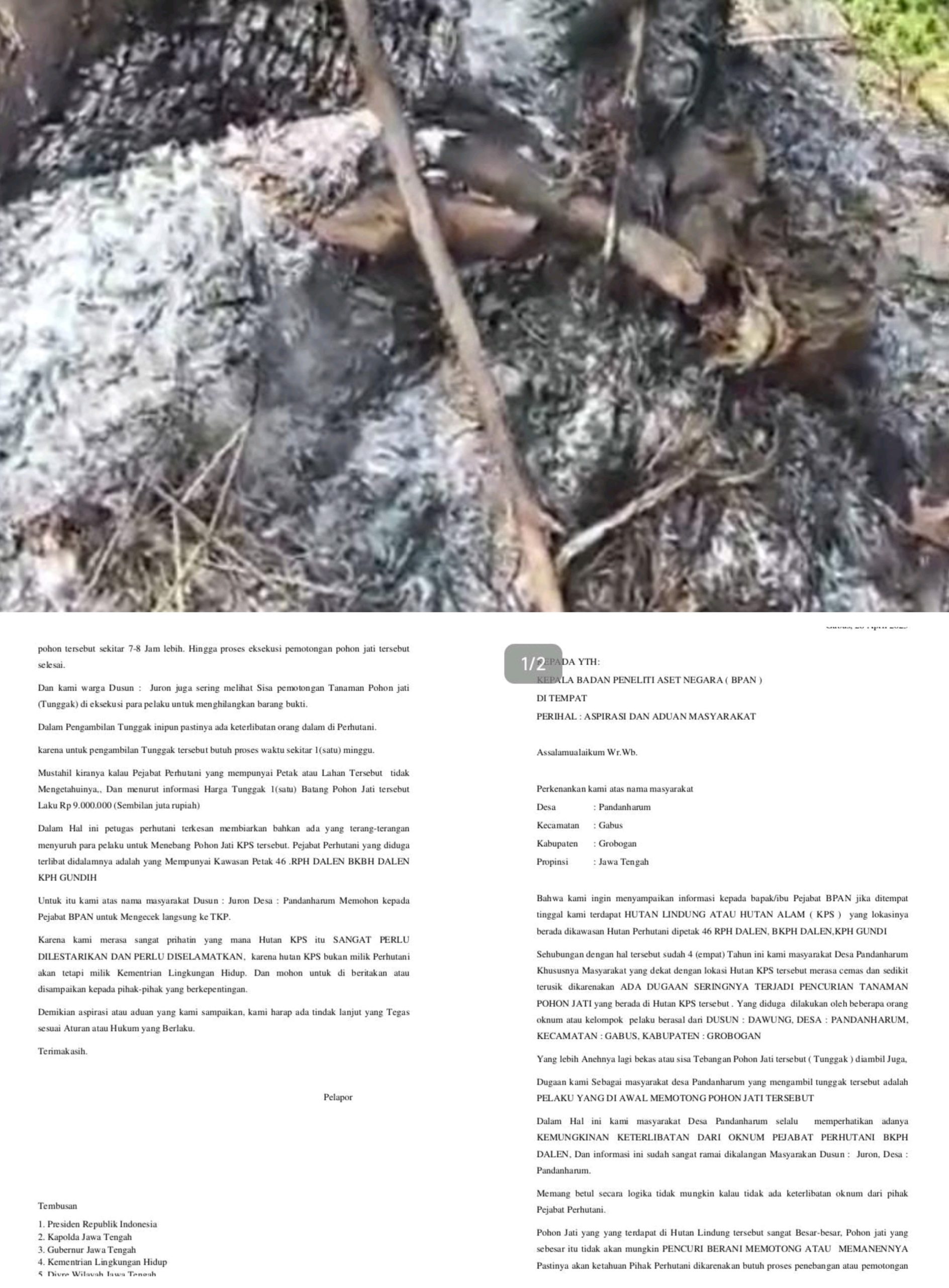 “Menebang jati berdiameter besar butuh 7–8 jam. Mustahil kalau petugas tidak tahu! Apalagi mencabut tunggak bisa seminggu penuh. Kalau ini dibiarkan, berarti ada kongkalikong!” tulis warga dalam surat aduan.
