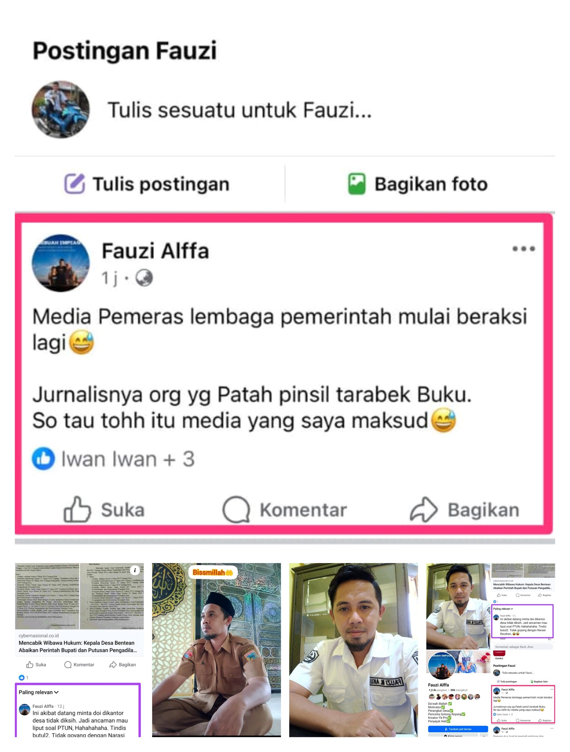 Selain itu, ia juga berkomentar pada status seorang wartawan dengan menulis: “akibatnya datang minta uang di kantor desa tidak dikasih. Jadi ancamannya mau meliput soal PTUN, hahahahaha. Tekan betul-betul. Tidak goyang dengan narasi murahan.”