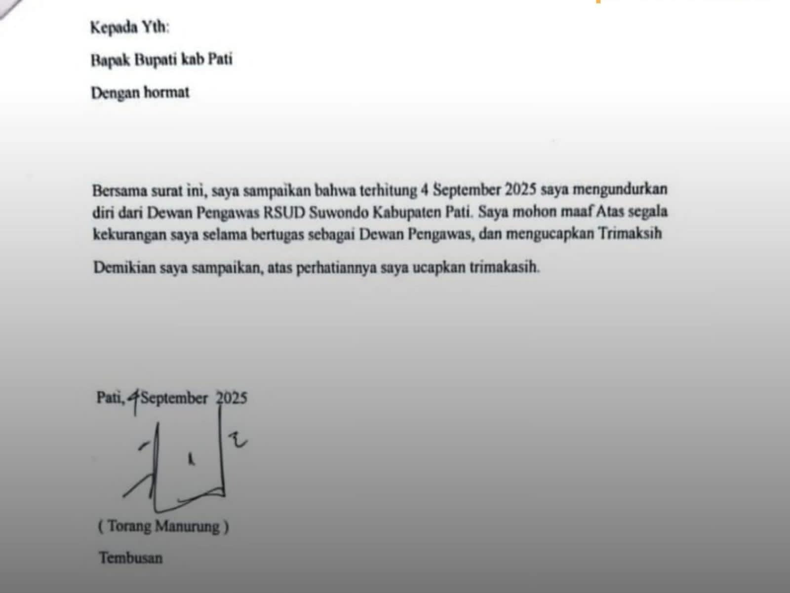 Aroma skandal semakin tajam tercium di RSUD RAA Soewondo. Surat pengunduran diri Torang Manurung dari jabatan anggota Dewan Pengawas (Dewas) yang beredar luas di kalangan media per 4 September 2025, menimbulkan tanda tanya besar. Benarkah ia benar-benar mundur, atau sekadar manuver politik menutup kasus?