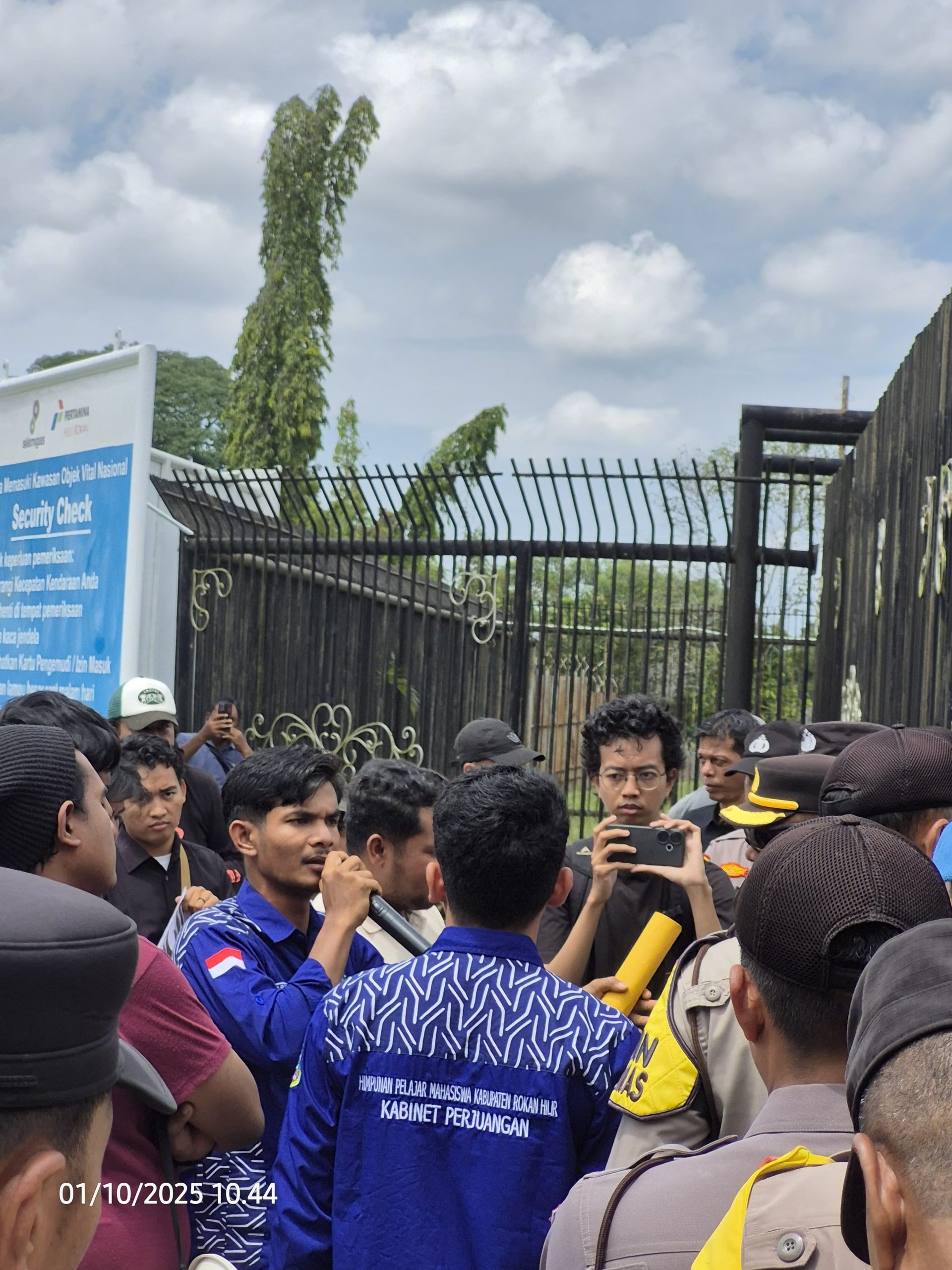 Himpunan Pelajar Mahasiswa Kabupaten Rokan Hilir (HIPEMAROHI) Pekanbaru menggelar aksi unjuk rasa ke kantor utama PT. Pertamina Hulu Rokan (PT. PHR) di Rumbai Pekanbaru, Rabu (1/10/25).