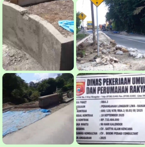 Temuan ini Nasionaldetik.com turun dilokasi Proyek penanganan longsor (RBA.3) berupa pembangunan siring beton dan rabat beton di bahu jalan, tepatnya di Jembatan Seranggas, Kecamatan Balik Bukit, kini menjadi sorotan tajam karena nilai anggarannya yang dinilai tidak masuk akal.