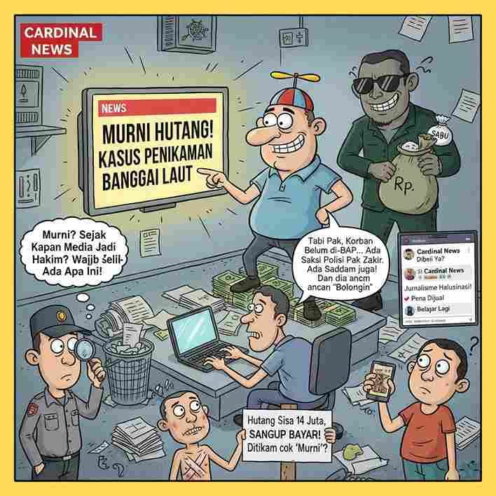 12 Januari 2026- Publik Banggai Laut sedang menyaksikan sebuah skandal jurnalisme yang sangat mencederai akal sehat dan proses hukum. Media Cardinal News lewat pemberitaan tertanggal 11 Januari 2026 secara lancang telah memvonis motif kasus penikaman Faisal sebagai “Murni Persoalan Hutang Piutang”.