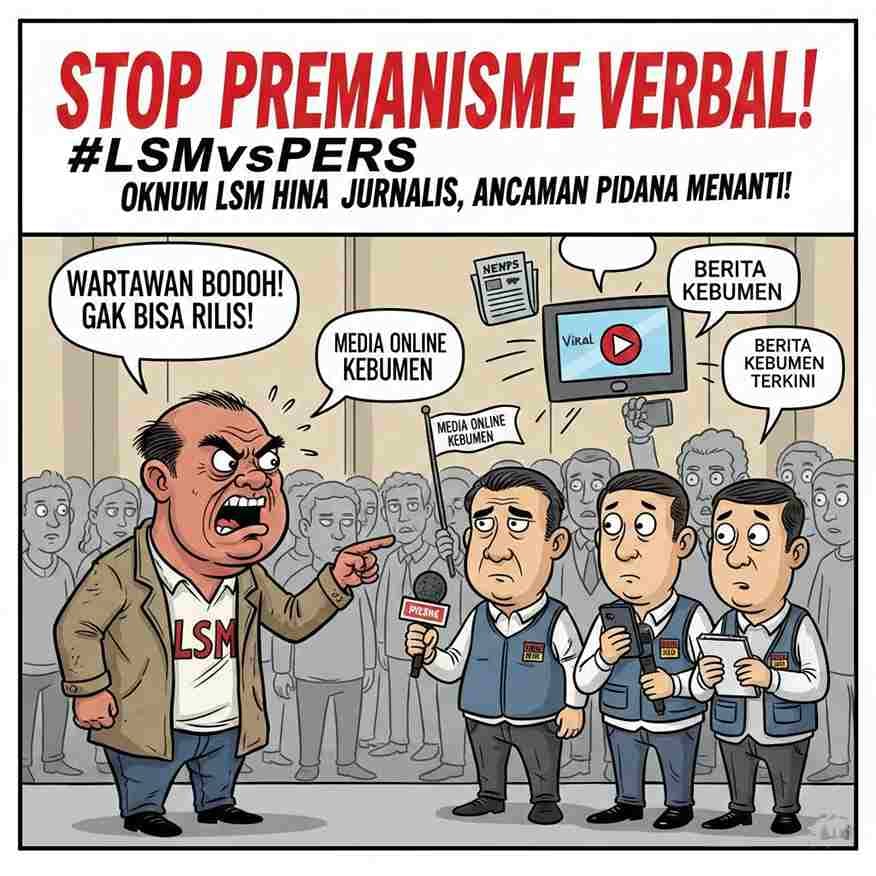 13 Februari 2026 – Sebuah aksi arogan yang mempertontonkan kebodohan berpikir dilakukan oleh oknum anggota Lembaga Swadaya Masyarakat (LSM) terhadap jurnalis media online di Kabupaten Kebumen. Dalam video yang viral di media sosial hari ini, oknum tersebut melontarkan makian “Wartawan Bodoh!” dan merendahkan profesi dengan kalimat, “Wartawan kok tidak bisa merilis!”.