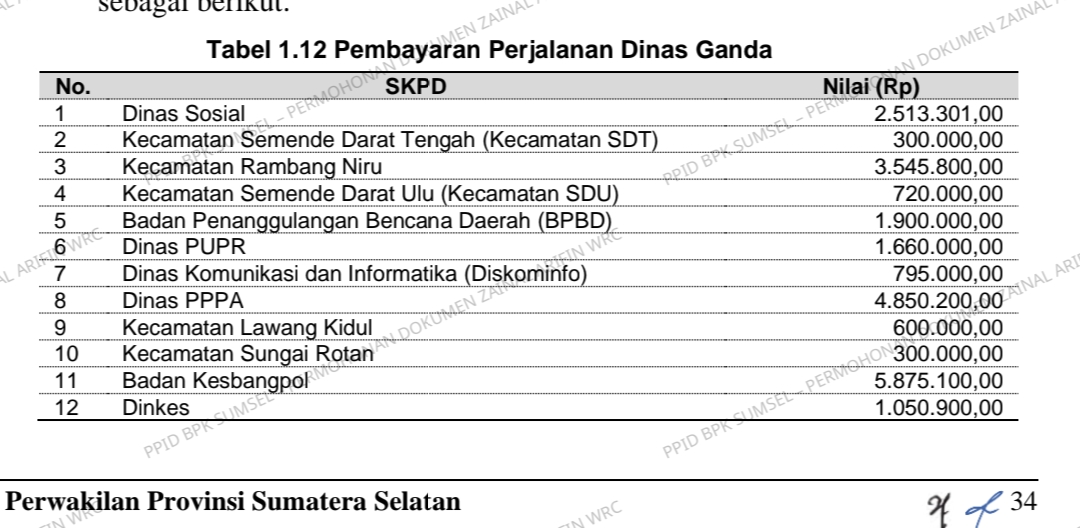 Pesatnya perkembangan pejabat korupsi di seputar pemkab Muara Enim Pasalnya Perjalanan Dinas Tidak Dilaksanakan ke Tempat Tujuan pada Enam SKPD sebesar Rp1.046.489.368,00