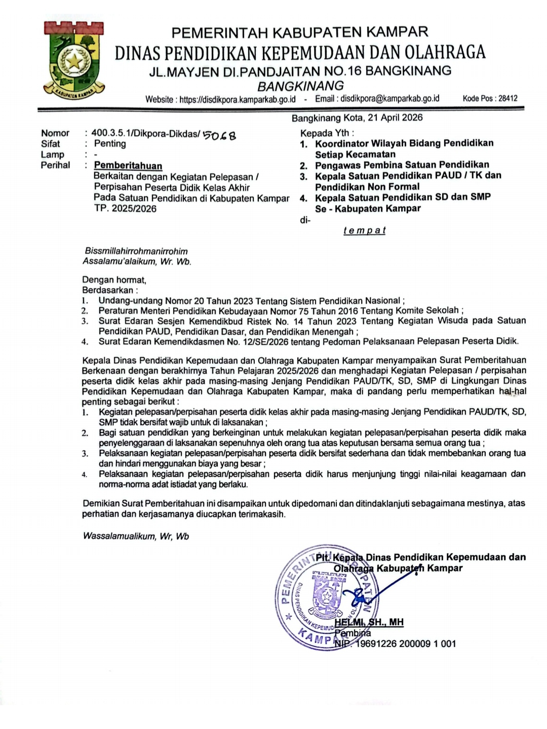 Surat yang ditandatangani oleh Plt. Kepala Disdikpora Kampar, **Helmi, SH., MH**, pada 21 April 2026 ini, menjadi dasar hukum bagi orang tua untuk menolak segala bentuk paksaan iuran perpisahan yang kerap muncul menjelang akhir tahun ajaran.